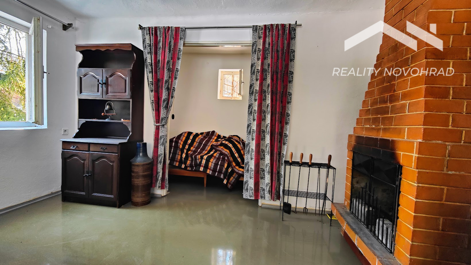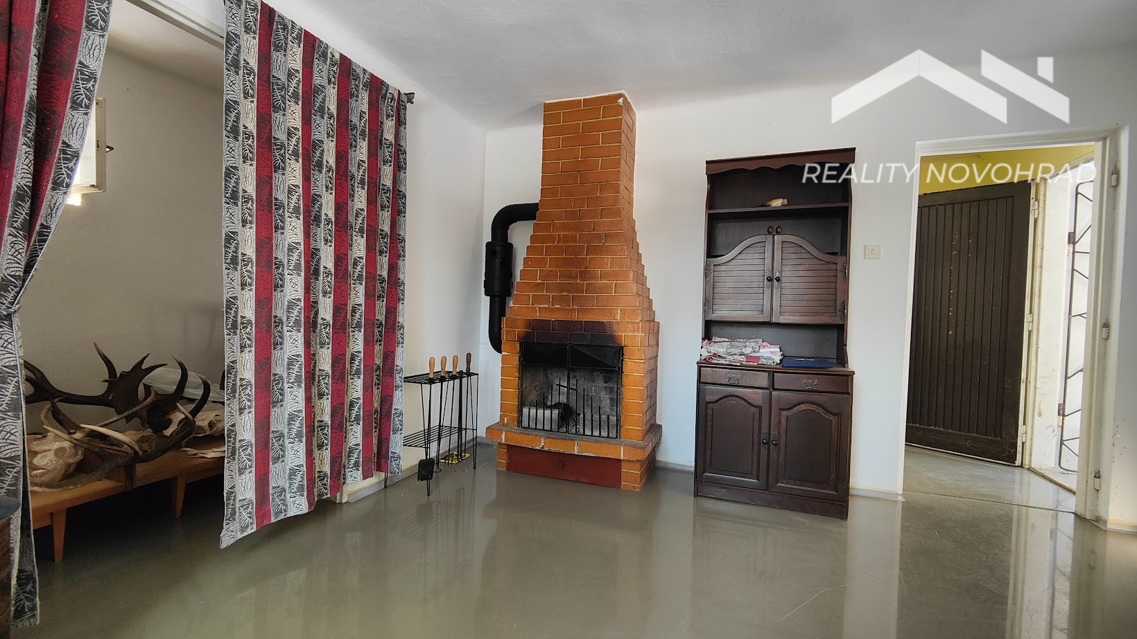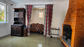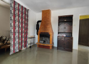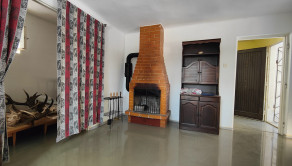 Obývacia miestnosť s murovaným krbom, ktorá vytvára teplú a útulnú atmosféru.